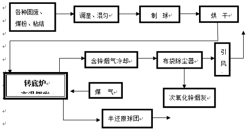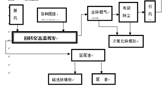 1、回转窑工艺(固态)----处理高锌低铁高炉瓦斯灰,回转窑高温火法处理,主要目的为了提取锌等有用金属,对废料的锌含量有一定要求,回转窑排出的尾渣,或外卖、或对其进行球磨磁选。回转窑废料含铁高则易结圈。