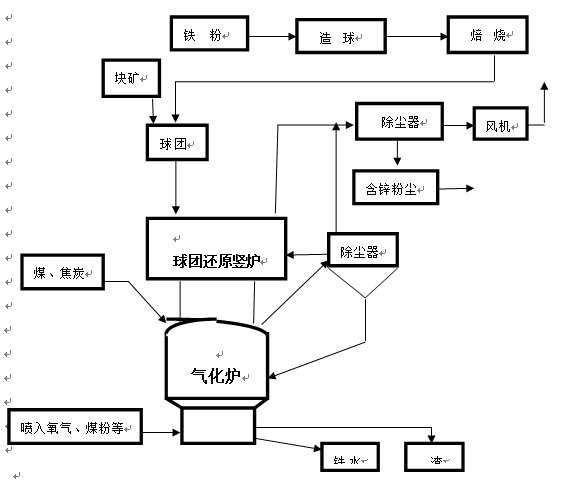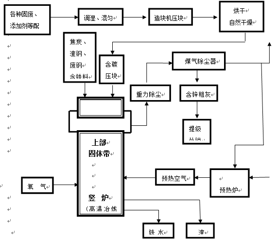 OxyCup竖炉法工艺---类似于一个直筒炉型的小高炉,各种含铁废料做成含碳压块加入竖炉内,竖炉直接产出铁水和炉渣,需加部分废钢等物料,可以在煤气除尘系统收集到含锌的烟灰或除尘泥。代表性的有山西太钢。