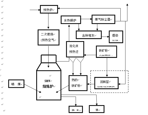 HISmelt熔融还原法是澳大利亚力拓公司开发的一项旨在只使用煤粉和矿粉,无烧结、无球团、无炼焦的完全替代现有炼铁工艺的一种熔融还原炼铁工艺,是一项新的创新工艺。国内山东墨龙引进的原建于澳大利亚奎那那的成套设备,经改进生产的HISmelt熔融还原生产线,已生产多年,积累了较多的生产经验。原生产工艺采用流化床预热还原铁矿粉,粘结等生产问题多,成为生产停顿的主要因素,引进后改进为回转窑预热还原铁矿粉,又带来了回转窑容易结圈的新问题,由于炉内熔渣氧化气氛过强,FeO过高,熔渣区炉衬寿命存在一定的问题(已增设渣区铜冷却板,取得一定效果),亦制约生产的稳定连续运行,有待进一步改进提高。SRV炉可以兼顾处理固废。