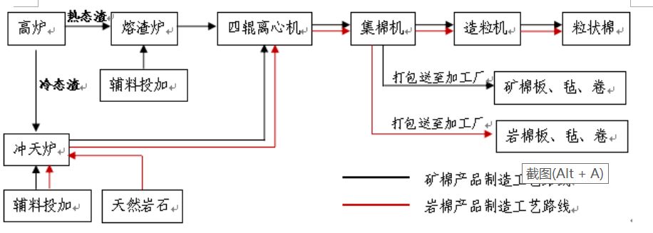 (2)采用热态渣制棉工艺的核心设备熔渣炉系统,比传统岩矿棉厂冲天炉熔制系统的可控性要强,熔体的熔制时间、粘度、温度、成份调整等可实现精确调控,且可连续生产。