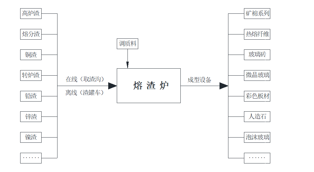 本热态熔渣高附加值规模化综合利用技术(熔渣炉工艺)在生产过程中,直接将热态熔渣通过渣沟引入到加料池内(或通过渣罐车截取熔渣引入),并且在热态熔渣流入加料池的同时,将调质料通过调质料加料口加入到加料池内,使调质料均匀的混合在热态熔渣中;然后熔体(即混合辅料的热态熔渣)由流液通道进入熔化池,使熔体进一步澄清和均化,配置有组合式搅拌手段,促进其玻璃化的形成,获取良好、均匀的熔体;最后,熔体由料道的出料口流出,供给后道成型设备加工成产品。