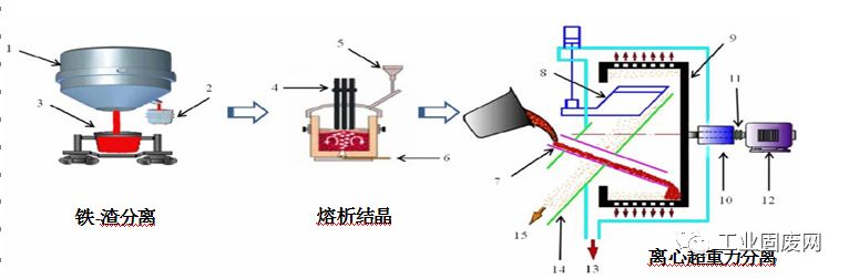 共生矿冶炼渣(熔融态冶炼渣),如钛渣、钒渣、稀土渣、高磷渣、硼渣,在渣罐中 经保温熔析结晶处理后,注入离心分离器,有价组分结晶相固体颗粒物留于离心筒内,而 熔渣液通过过滤板流出反应器,从而实现有价组分的富集分离。