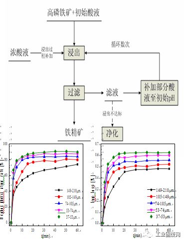 完成了 50 升级浸取脱磷试验。对于磷含 量 0.56%和铁含量 51.7%的鄂西高磷铁,在液 固比比 3:1 常温条件下,矿石磷含量可控制在