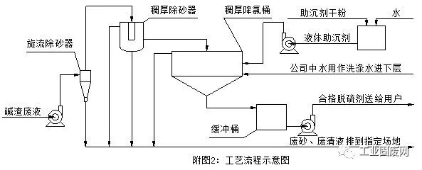 蒸馏废液经碱渣泵送到沉砂器,砂液从底部排出经砂液管线进入重碱车间的废液泵坑,沉砂器上层出液进入洗泥桶上部,与氧化塘水逆流洗涤,洗泥桶上层出水经清液管返回废液前池,底部排泥进入废泥槽,脱硫剂浆液经泵送至热电脱硫工序。工艺流程图如下图: