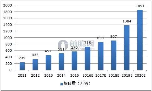 我国汽车的使用年限一般为8-10年,参考行驶里程为50-60 万公里。随着汽车保有量的持续增长,废旧汽车报废量也将相应大幅增加。前瞻产业研究院发布的《报废汽车回收行业市场前瞻与投资分析报告》指出,按照成熟市场报废汽车占汽车保有量6%-8%的水平计算,中国汽车报废高峰已临近,2017年废旧汽车理论报废量将突破800万辆,2019年左右将超过1300万辆,并保持高速增长。