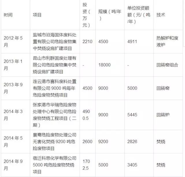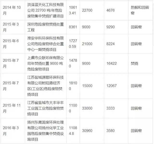 随着危废行业的管理加强,逐步规范,需要集中处理,而这就要求了危废项目具备综合处理处置的能力,包括焚烧、填埋、物化、稳定化等多种无害化处置设施和资源化的能力,危废综合处置项目会越来越多。统计近年的部分危险废物综合处置项目的情况,列于下表中,可以看到:1)危废综合项目项目根据各地的实际需求和条件,选择处置方式的搭配,单位投资的均值,在2000-5000元/(吨/年)。2)项目需求是全国性的,东西部均有较大需求。3)总处理规模在5万吨/年以上的大型危废综合处置项目开始频繁出现。