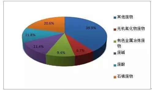 危险废物主要来自工业行业、医疗废物或其它日常生活过程中。从统计情况来看:1)产生量最大的为工业危险废物,占全部危险废物产生量的70%以上,其次为医疗废物,约占14%。2)工业危险废物主要来自化学原料与化学制品制造、非金属矿选业、有色金属冶炼加工、造纸等行业。3)工业危险废物种类主要为石棉废物、废酸废碱、金属冶炼废物、无机氰化物废物等。