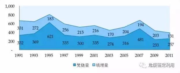 图4:1991-2011年美国危废焚烧、填埋量统计(单位:万吨)