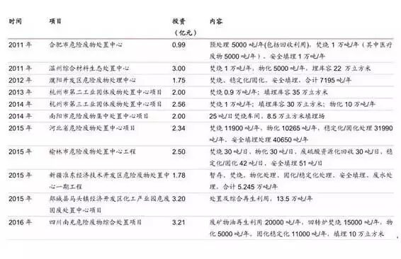 随着危废行业的管理加强,逐步规范,需要集中处理,而这就要求了危废项目具备综合处理处置的能力,包括焚烧、填埋、物化、稳定化等多种无害化处置设施和资源化的能力,危废综合处置项目会越来越多。统计近年的部分危险废物综合处置项目的情况,列于下表中,可以看到:1)危废综合项目项目根据各地的实际需求和条件,选择处置方式的搭配,单位投资的均值,在2000-5000元/(吨/年)。2)项目需求是全国性的,东西部均有较大需求。3)总处理规模在5万吨/年以上的大型危废综合处置项目开始频繁出现。