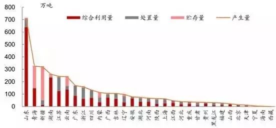 2014年,危险废物产生量前五的省市为山东、青海、新疆、湖南、江苏,五省的危废产生量合计占全国产生量的比例达51.2%,集中度高;其中青海、新疆、云南受发展条件限制,当前有大量危废转为了储存量,市场丞待开发;而处理处置量前五的省市为山东、湖南、江苏、广东、云南,C5集中度也高达50.7%。